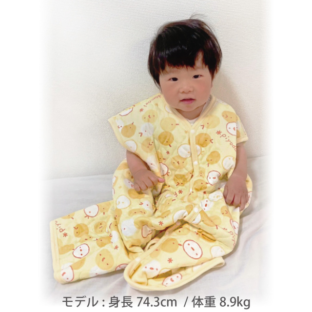 機能的な2WAYコンビスリーパー。 ボタンの留め替えをするだけで、スリーパー(ドレス型)、コンビ(足つき型)として使えます。 また、成長に合わせて防寒ベストとしても着用できるので、長い期間ご愛用していただけます。 体温調節がむずかしい赤ちゃんにとって手軽に寒さ対策や体温調節が取れるので1枚あると重宝するアイテムです。男の子、女の子どちらでも使えるぴよだまり柄。安心の日本製です。