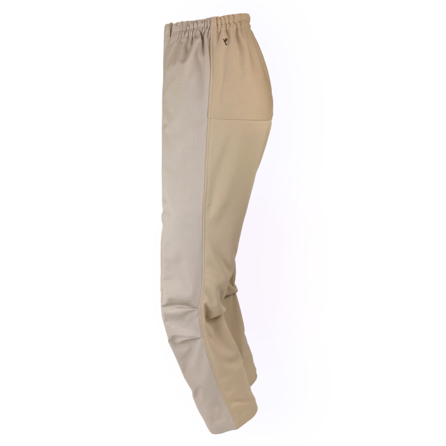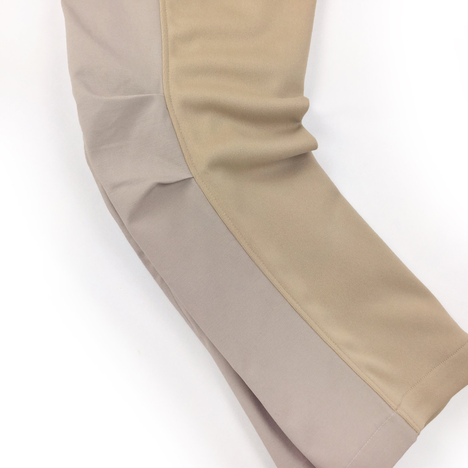 また、後ろ股上の適度なゆとりと素材の伸縮性を活かした特徴的な切り替えにより、座ったときの腰廻りをしっかりカバーすると同時に腹部の圧迫感を軽減。さらに、前側にいれたタックは絶妙なゆとりを生み出し、膝を深く曲げても膝廻りが締め付けられることがなくゆったりとした履き心地をキープします。